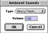 Selecting "View Sounds..." offers the choice of Ambient or Random Sounds. Ambient Sounds switches to a colour-coded view (as with lights and liquids) and opens a drawer enabling the creation of specific sounds. Double-clicking on a value or creating a new one opens the parameter box below (similar to Forge's) through which a specific sound can be selected, the volume set and a name assigned to that combination. Once the box is closed that combination is saved and appers in the drawer. It can be assigned to a specific polygon using the Select tool. The Dropper tool will also identify a sound already assigned to a polygon.