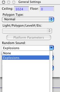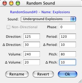 Random Sounds are assigned to individual polygons using the Basic Inspector when constructing Polygons. One of the drop-down menus available duplicates the list of Random Sounds found in the Configuration Editor; by selecting a particular entry when a polygon is active that Random Sound will be assigned to it. It is possible for a polygon to possess both Random and Ambient Sounds.