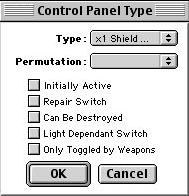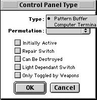 Forge defined Control Panels as textures were added to walls in the Visual Mode. Three different but similar panels would appear depending on which texture was being added. Each had a drop-down menus for control panel type and permutation (what it was linked to) as well as check-boxes that regulated the behaviour of those panels.