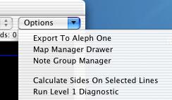 The Options drop-down menu enables a short-cut for Aleph One export, a Map Manager Drawer, a Note Group Manager and two diagnostic tools. The Note Group Manager is currently inactive (in future versions it will enable notekeeping for group development of scenarios) while the Map Manager opens a drawer at the side of the window providing quick modification of the editting properties.