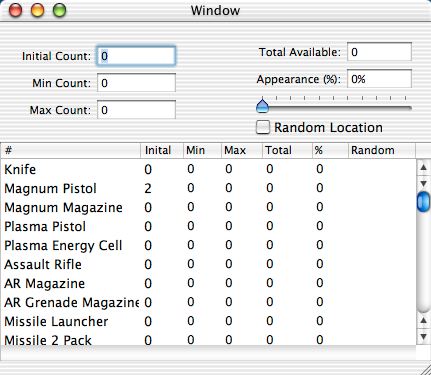 This is similar to Forge's Set Item/Monster Parameters panels. Starting with the number of that particular object on the map you can specify whether they can be replenished, how often, a minimum and maximum number and a total stock. All monsters and weapons are present on this one panel. The infinite number option that was in Forge is obtainable by setting the "Available" number to 0, contradictory as it sounds.