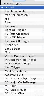 When a polygon is selected the Basic Inspector (Tools menu) enables the designation of a polygon type and definition of the necessary parameters through a series of drop-down menus. All the usual polygon types are available plus some Marathon 1 types: Ouch/Damage is currently operative and Glue may be. If the polygon is defined as a trigger then the second menu is activated with a list of options appropriate to that trigger.