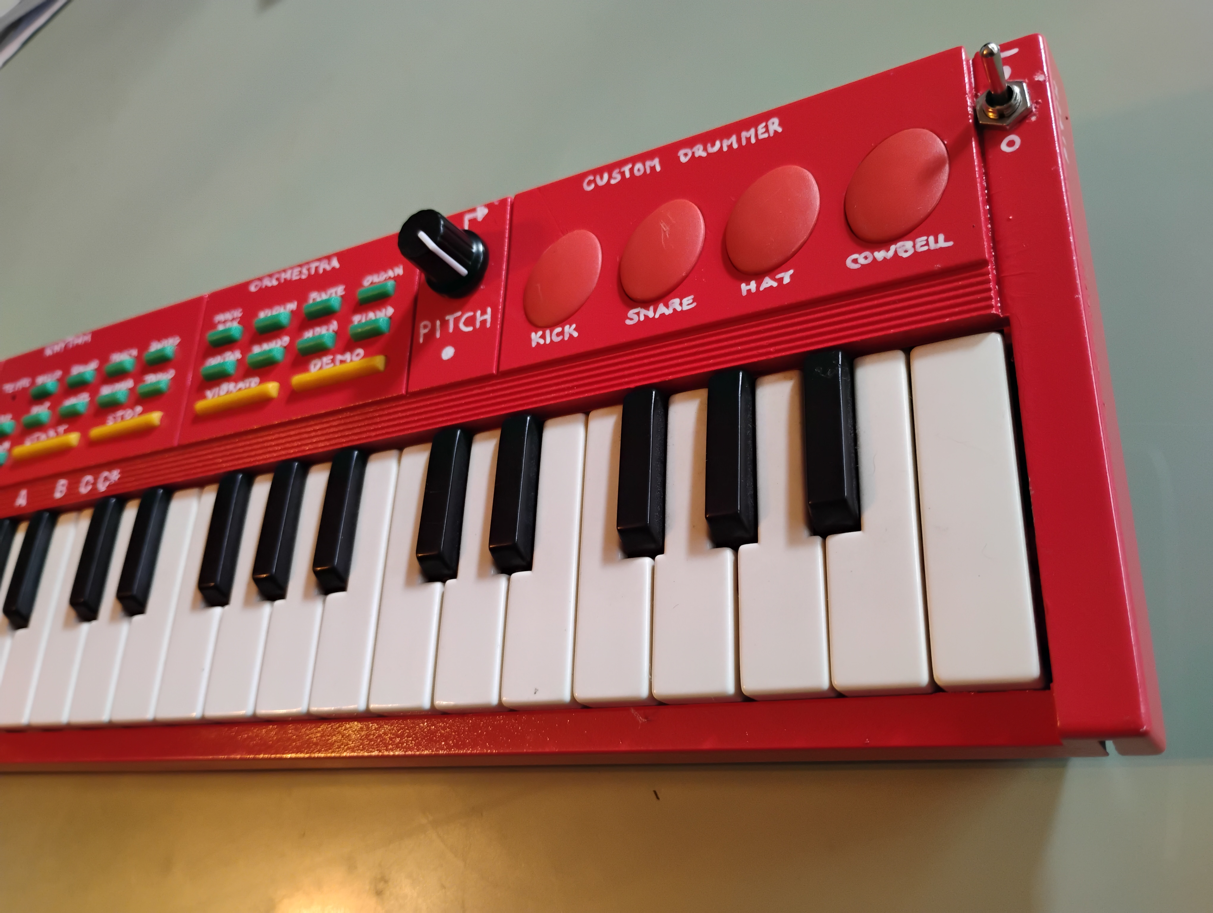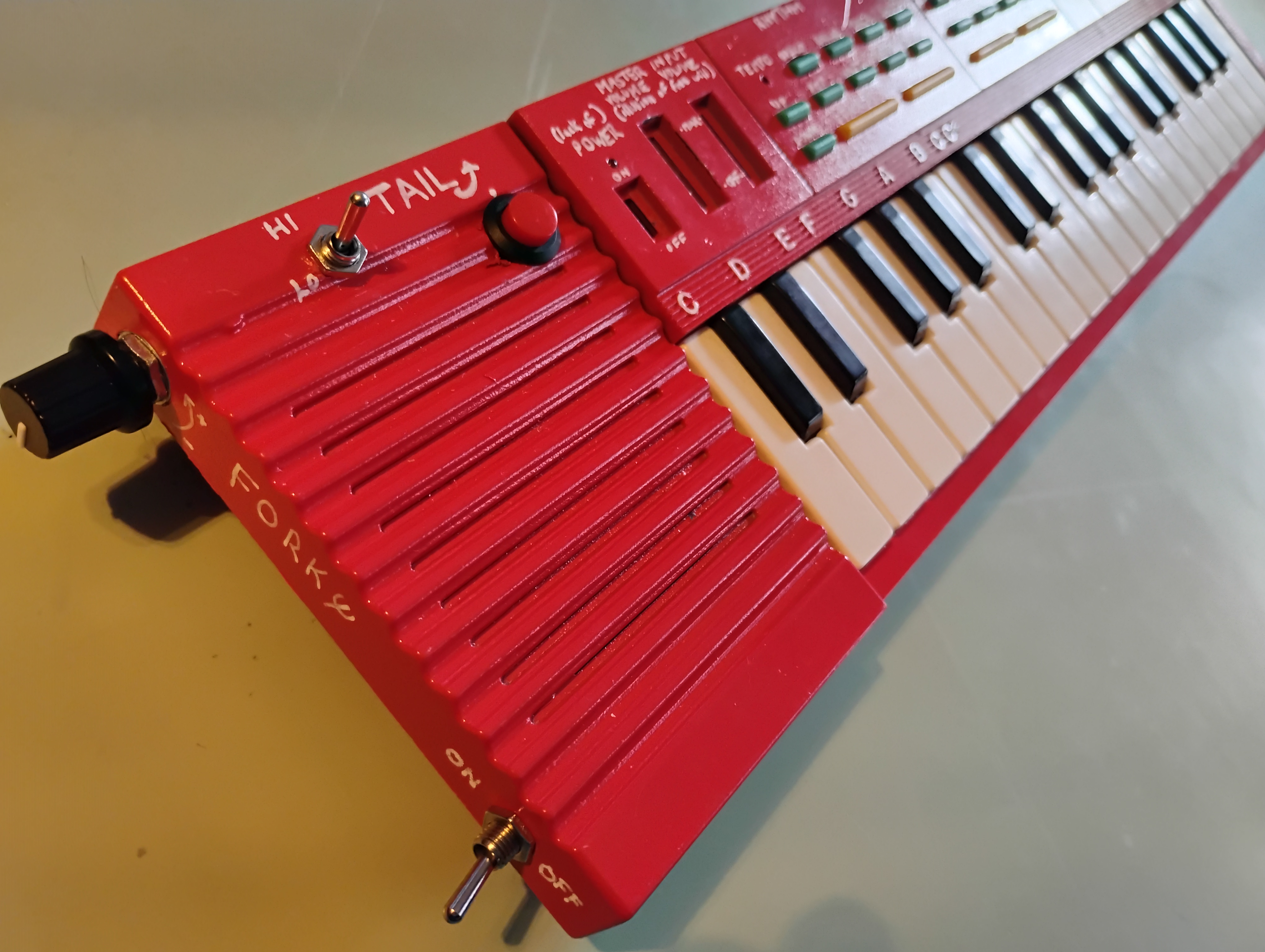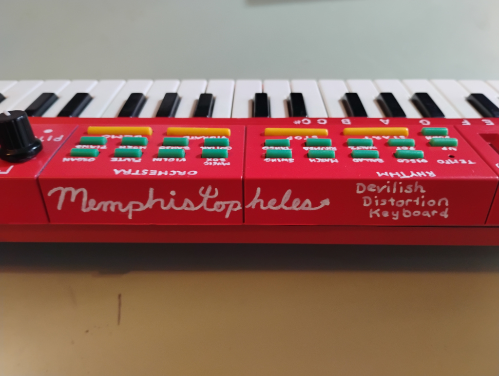This Hing Hon EK-001, the first one I've modified, was a commission of sorts. A friend saw the Glitch Witch and wanted to know if I could put something together for her brother's birthday. They're from Memphis, Tennessee, so even before I had done much with the keyboard internally I decided to call it Memphistopheles. Aside from the reference to their hometown, this name turned out to be very appropriate.