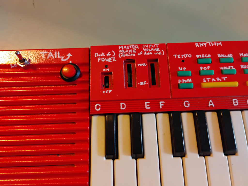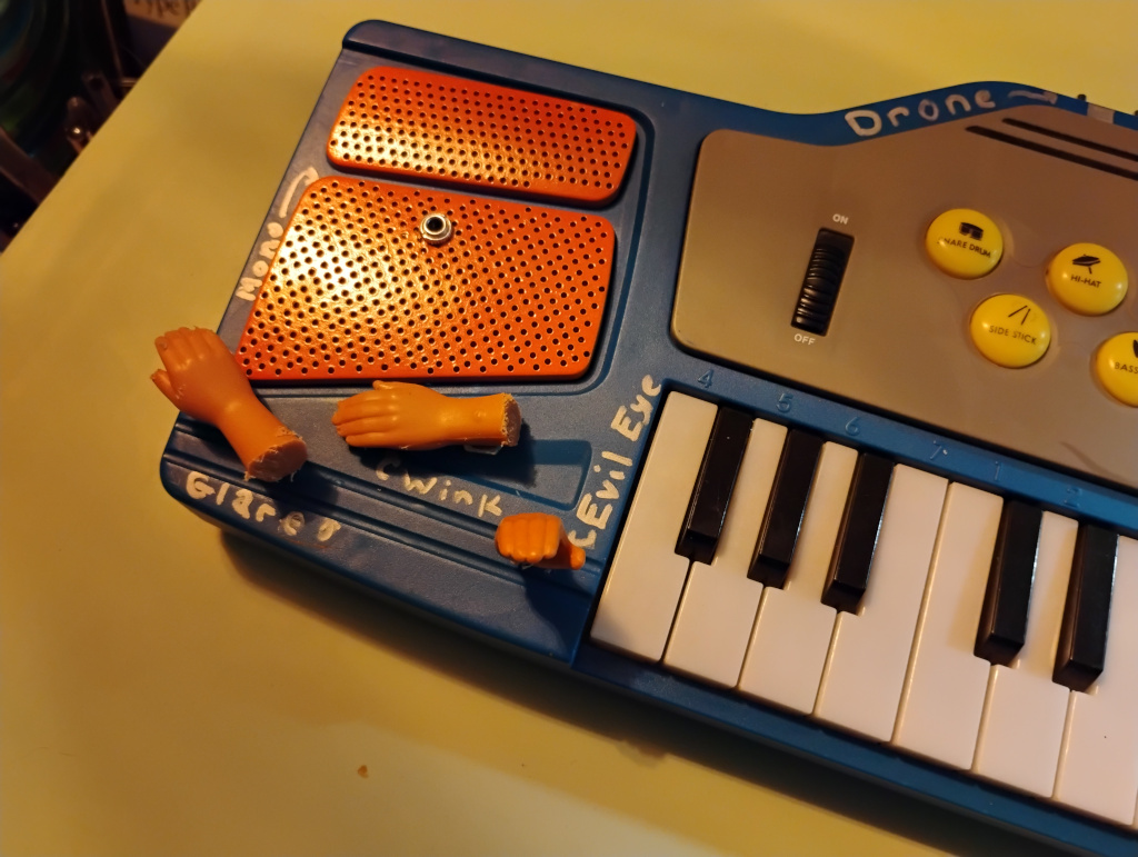 This instrument started life as a Playskool PS-635. The good people at Primitivo / The Noisy Pot asked me to modify one of their PS-635s as a giveaway prize for thei 16 August 2025 show. They gave me a free hand in choosing the bends, requesting only that I add an aux jack and paint it in Primitivo livery. The main challenge I faced with this thing, aside from its blob-circuit innards, was a combination of constrained interior space and thick, ultra-durable plastic casing. I’m proud of how it turned out, and extremely happy that the prize-winner has started her own joyful exploration of its capabilities.