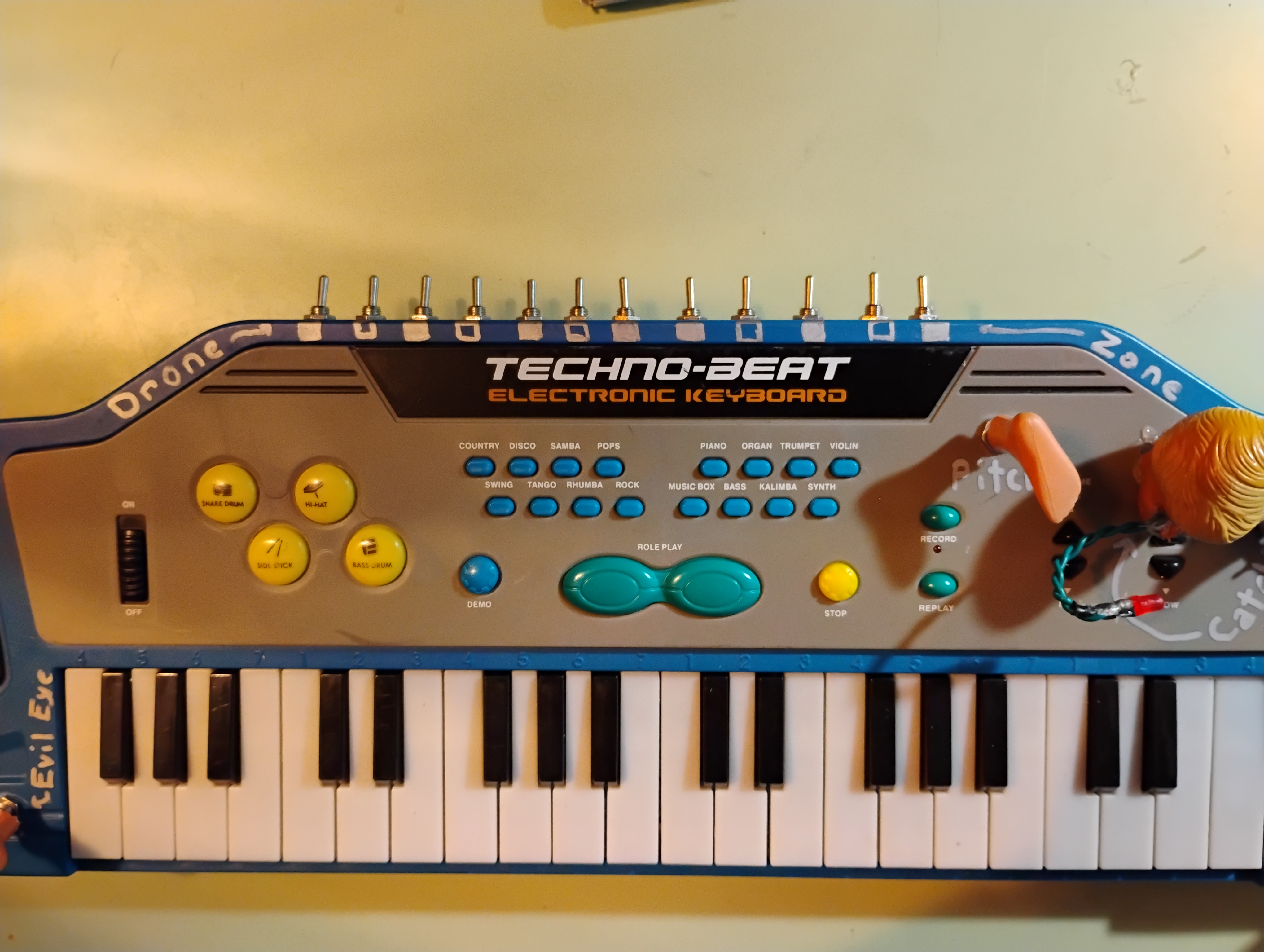 I'm happy to report that I was wrong. One key resistor allowed for a decent pitch-bend effect. The signal path had a much nicer-sounding stage that allowed me to add a crisp, loud mono output. And it turns out that this toy keyboard, unlike many in its price range, has extremely high polyphony. I added switches along the back to create a "drone zone" for the lowest octave.
