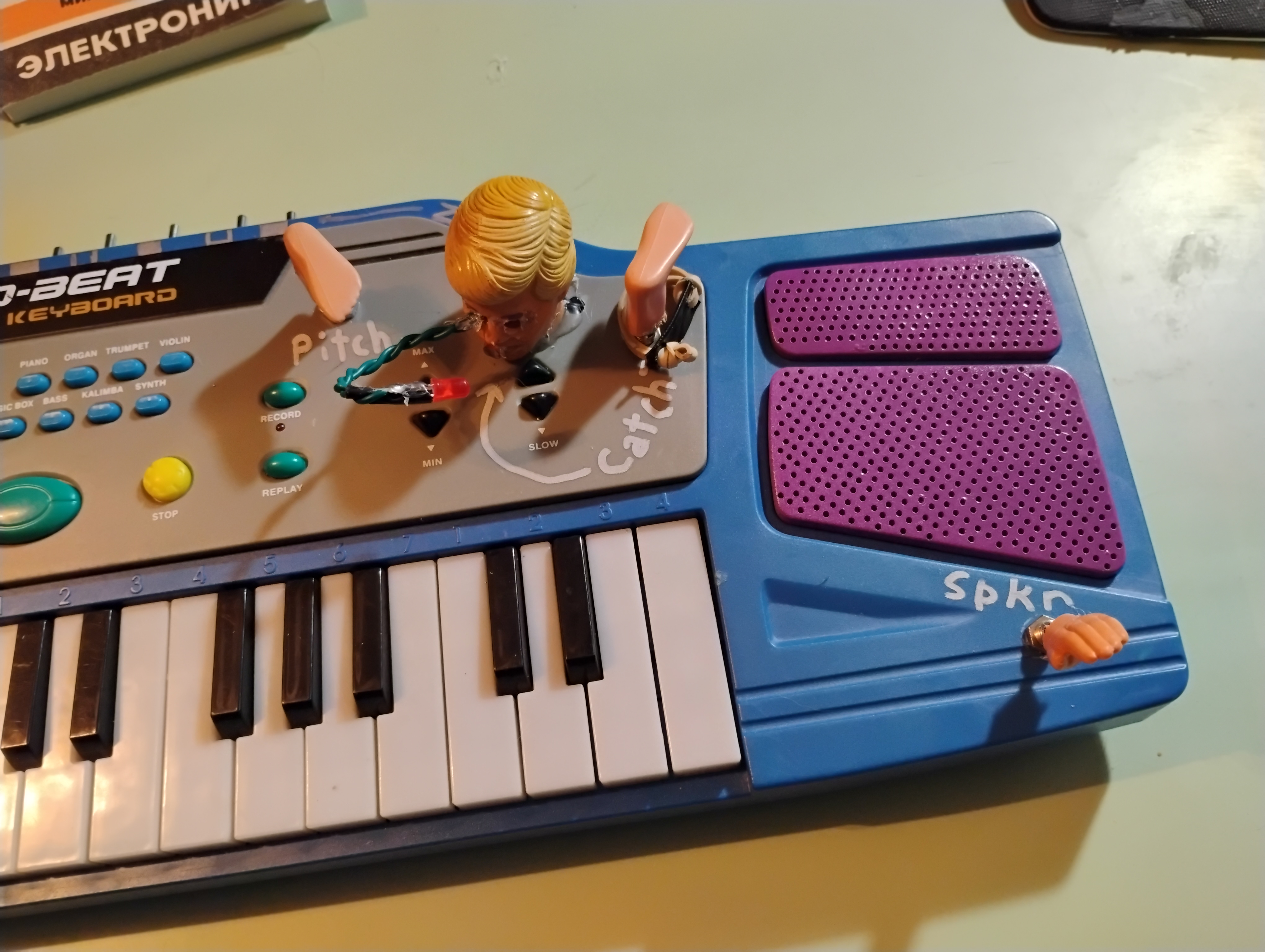 The base Manley Techno-Beat Eletronic Keyboard did not seem too promising. The sounds are OK, but bland, and internally it's a blob chip with a few SMT components. I wasn't sure I'd be able to do anything interesting with it. But because the Noisy Pot had another giveaway coming up, I wanted to see if I could challenge myself instead of resorting to better-trod paths.
